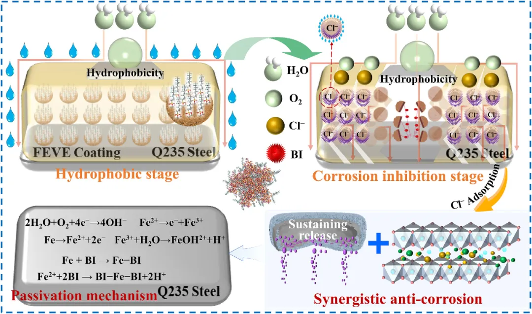 以DE为载体,组装具有离子交换能力和高效缓蚀剂BI的层状双氢氧化物(BI@LDH/DE),使用1H,1H,2H,2H-全氟癸基三乙氧基硅烷对BI@LDH/DE进行改性,得到疏水缓释填料BI@LDH/DE/PFDTS,然后将BI@LDH/DE/PFDTS添加到氟碳树脂(FEVE)中,制得BI@LDH/DE/PSDTS/FEVE复合涂层。 所制得填料的缓蚀剂(BI)负载率为17.79wt%。所制得复合涂层的厚度为4.43nm,填料含量为30wt%时,该复合涂层具有最佳的耐腐蚀性,低频阻抗模量比纯FEVE涂层高出三个数量级。 本研究通过设计疏水性微胶囊填料构建的防腐涂层,在涂层表面功能失效后仍能为钢结构设备提供持久保护,在实际应用中具有广阔的前景。 制备工艺流程图 填料和涂层制备工艺流程图。 防腐机理示意图 30wt%填料复合涂层的防腐机理示意图。 数据来源与出处 相关研究成果以“Sustained-release diatomite microcapsules are used in hydrophobic coatings to achieve multiple synergistic anti-corrosion”为标题发表在《Chemical Engineering Journal》上。
