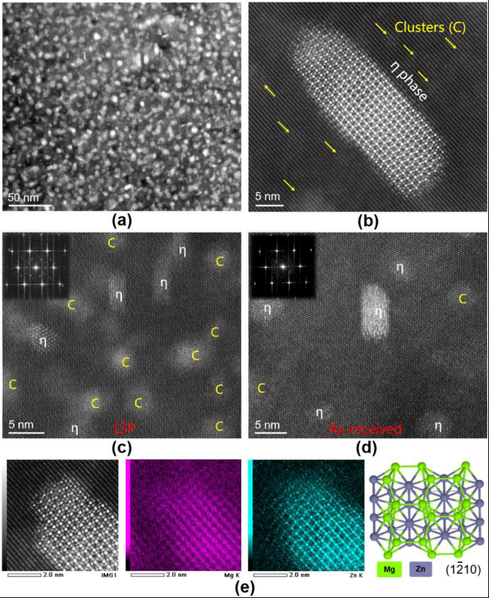 图4.本体内的纳米沉淀物。(a)LSP样品中纳米沉淀物的低放大率HAADF-STEM图像。(B)LSP样品的高分辨率HAADF-STEM图像,电子束沿着Al排列<112>。(c)LSP样品中纳米沉淀物的高分辨率HAADF-STEM图像,沿沿着Al采集<110>。(d)接收样品中纳米沉淀物的高分辨率HAADF-STEM图像,也沿着Al观察<110>。(e)η相沿着Al的高分辨率EDS图<112>Al,显示<12 10>η晶体学取向和相应的原子模型。