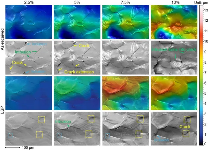 图10.激光共聚焦显微镜监测的原位拉伸试验。彩色图表示表面高度轮廓,反映拉伸加载过程中晶粒变形引起的高度波动。底层灰度图像显示实际晶粒形态。右边的彩色条表示轮廓图的高度标度,单位为μm。