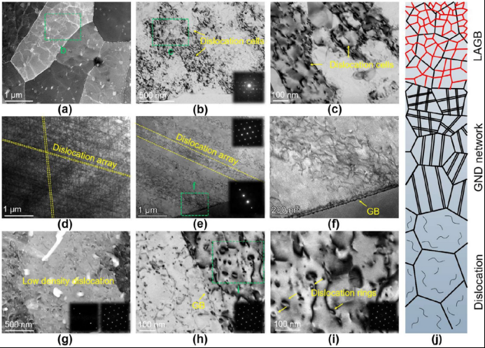 图1. LSP结合时效处理后7075铝合金沿着深度方向的TEM图像。(a-c)不同放大倍数下表面的TEM图像显示出细化的晶粒和胞状位错亚结构。(d)距离表面200 μm深度处的阵列位错形态图像。(e,f)距离表面600 μm处的图像。(g-i)拉伸样品核心处的无序位错形态,距离表面约1500 μm。(j)位错主导的梯度结构示意图。注:(b)中的TEM图像是在<100>Al区轴下获得的,所有其他TEM图像都是在相同的双光束条件下获得的。
