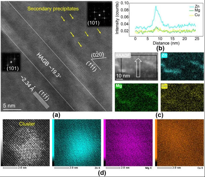 图3.在HAG B周围进行LSP和缺陷辅助低温时效后,7075铝合金的二次纳米沉淀物形态。(a)包含HAG B的高分辨率HAADFSTEM图像,伴有显示HAG B两侧FFT图案的插图。(b,c)线扫描(b)和来自(a)中所示的HAG B上的EDS分析的元素映射(c)。(c)中的方框区域对应于(b)中为EDS线扫描选择的区域,并且箭头指示扫描方向。(d)二次纳米沉淀物的高分辨率HAADF-STEM图像沿着相应的EDS图。电子束平行于<112>Al。