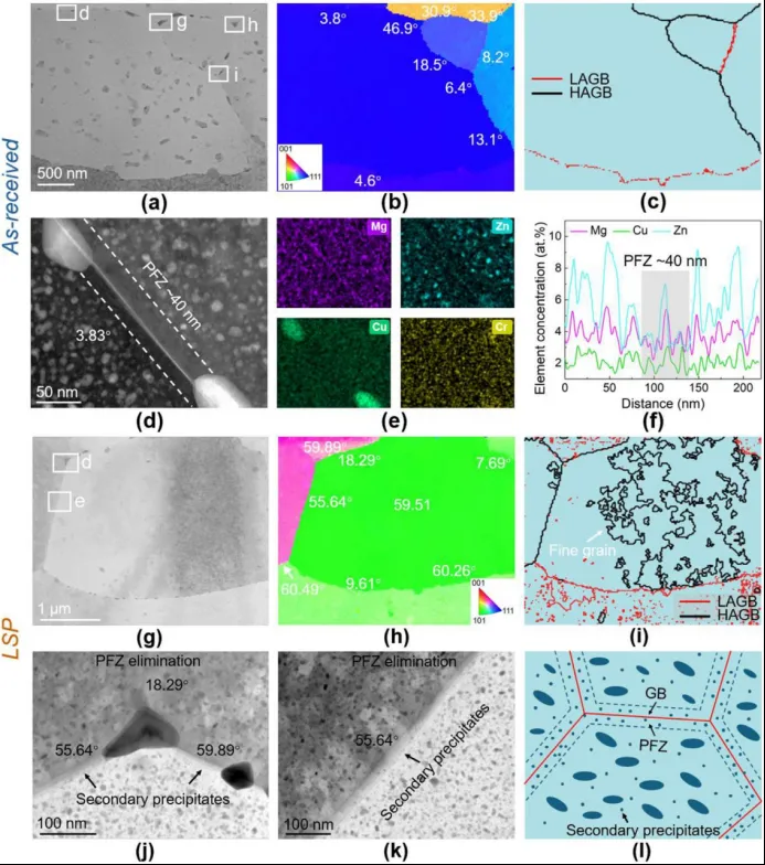 图2.接收态和LSP态7075铝合金的纳米沉淀物形态。(a-c)接收态的低放大率TEM图像,以及来自旋进衍射的相应IPF图(b)和GB分布图(c)。(d-f)(a)中方框区域的Magnetic HAADF-STEM图像,(g)LSP状态的TEM图像(g)和对应的IPF(h)和GB分布图(i)。(j,k)(g)中所选区域的放大视图。(l)LSP状态下纳米沉淀物分布的示意图,其中椭圆形表示初级纳米沉淀物,小点表示次级纳米沉淀物。