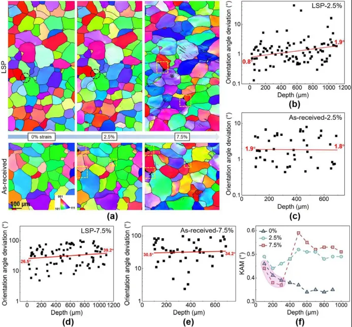 图8. LSP状态和接收态样品的准原位EBSD拉伸分析。(a)LSP状态和接收态样品在0%,2.5%,LSP状态(b)和接收态(c)样品在2.5%应变下的深度相关的晶粒取向偏差。LSP状态(d)和接收态(e)样品的深度相关的晶粒取向偏差(f)在不同应变水平下LSP状态样品的作为深度的函数的核平均取向差(KAM)。