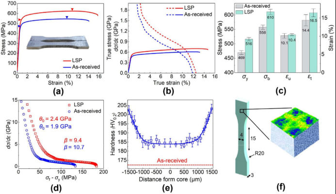 图6. 7075铝合金的准静态力学性能。(a)工程应力-应变曲线,插图显示了LSP处理后实际的3 mm薄壁部件。(b)真实应力-应变曲线。(c)通过平均至少3条应力-应变曲线获得的准静态机械性能统计。(d)瞬时应变硬化率(θ)与流动应力增量(B)中合金的(σf − σ y)。(e)结合LSP和缺陷辅助低温时效的梯度结构试样的横截面硬度。(f)LSP处理后拉伸试样的规格和表面上的微尺度冲击痕迹。