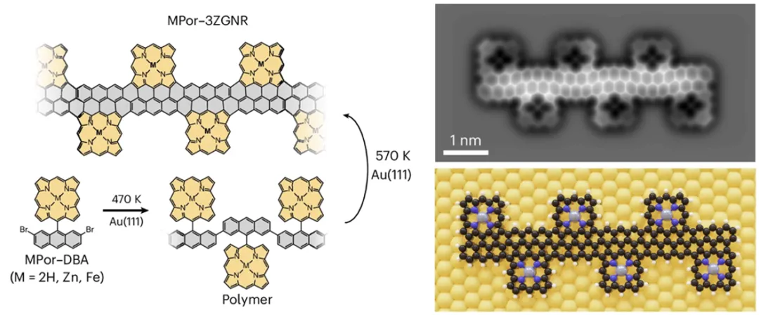 石墨烯纳米带作为一维石墨烯材料,因其非零带隙和可调控的能带结构,在半导体器件、自旋电子学及量子技术等领域展现出重要应用前景。通过自下而上的表面合成策略,可实现对其结构的精准构筑与性质的精细调控。然而,目前石墨烯纳米带的电子结构与性质调控主要依赖其π电子体系,尚未有研究成功在纳米带中引入d电子对其进行改性。卟啉作为一种大环分子,其内部空腔可实现不同金属掺杂。将卟啉结构引入石墨烯纳米带中,有望通过d-π电子间的杂化作用,进一步调控纳米带的电子结构与物理化学性质。 中国科学院宁波材料技术与工程研究所顾彦伟副研究员,联合瑞士联邦材料科学与技术研究所与德国马克斯普朗克高分子研究所,率先合成了关键前驱体分子MPor–DBA(M = 2H, Zn, Fe),并通过热诱导逐步反应,在Au(111)表面上实现了自下而上的精准合成,成功制备出一系列具有周期性卟啉边缘拓展的锯齿形石墨烯纳米带材料(MPor–3ZGNR)。研究发现: (1)Zn掺杂的ZnPor–3ZGNR具有高度分散的导带和价带电子结构,其载流子有效质量极低,展现出极高的载流子迁移潜力; (2)2HPor–3ZGNR能够自发捕获金衬底表面的Au原子,形成金属化单元,引发局部电荷掺杂,从而与未金属化单元之间形成显著的电子态差异,成功在纳米带内部构建出P–N异质结; (3)掺杂磁性金属Fe的FePor–3ZGNR中,Fe的d轨道与纳米带的π电子态发生强烈杂化,实现了相邻铁单元间的长程自旋超交换耦合。 本研究不仅为原子级精确的卟啉—锯齿边缘石墨烯纳米带杂化体系的构建提供了新方法,更通过金属中心的灵活调控,为未来开发高性能半导体、化学传感器及量子自旋链等器件,提供了一个强大而多样的材料平台。 图1 周期性卟啉边缘拓展石墨烯纳米带 相关成果 Nature Chemistry Zigzag graphene nanoribbons with periodic porphyrin edge extensions DOI: 10.1038/s41557-025-01887-9