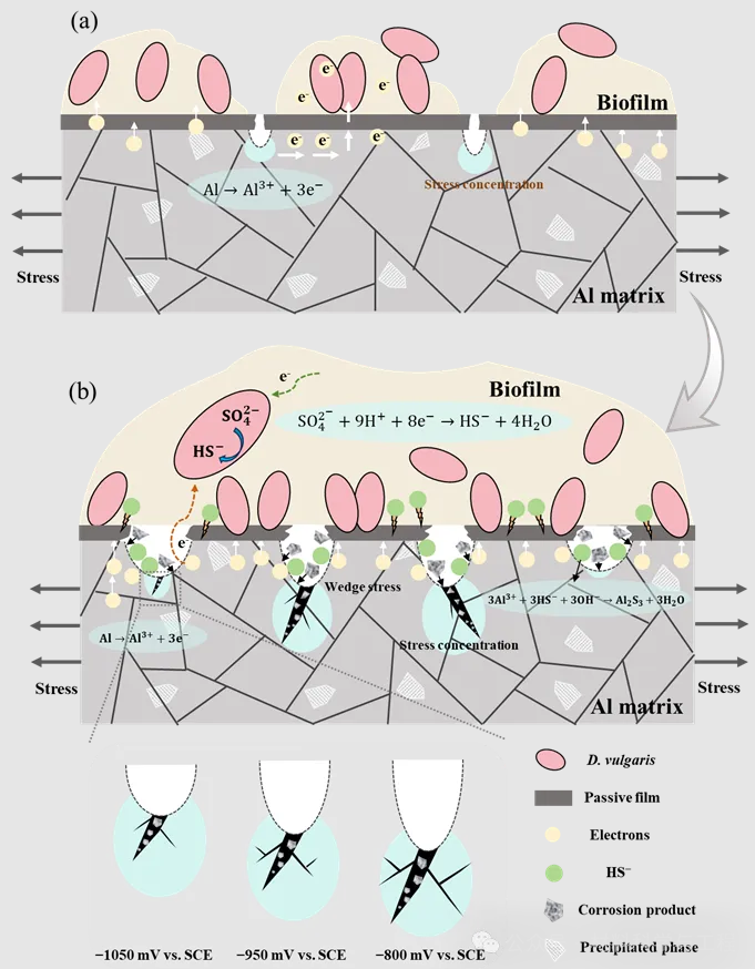 图4 7xxx铝合金在D. vulgaris介质中的SCC机理示意图:(a)初始阶段,(b)成熟阶段