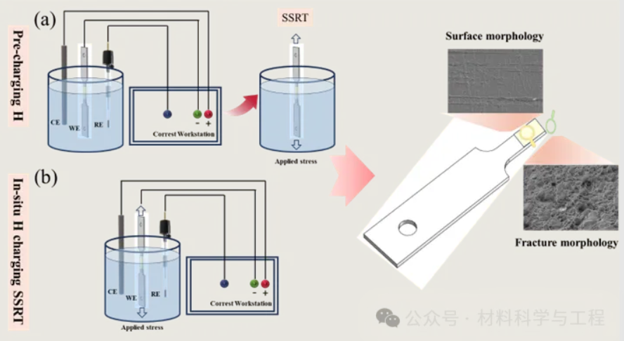 图1 电化学充氢及SSRT实验示意图:(a)预充氢,(b)原位充氢