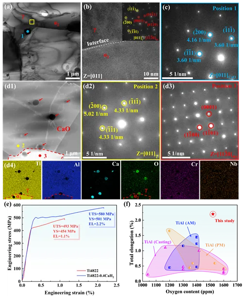 图4、Ti4822-0.4CaH2合金的STEM分析:(a-c) STEM形貌图及对应区域的HRTEM图和SAED图;(d1-d4) 不同区域的STEM形貌图及对应区域的SAED图和元素面扫分布图;(e-f) 纯Ti4822和Ti4822-0.4CaH2合金的室温拉伸曲线及性能对比图。