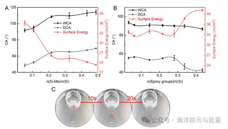 涂层的制备: 将MPDMS(0.07mol,12.74g)、DMES(0.03 mol,4.44g)、KH560(0.04mol,9.44g)和TEOS(0.0446 mol, 7.94 g)在三颈烧瓶(250 mL)中混合。随后,将SiO2NPs(2.6g)和四 甲基氢氧化铵(0.1mL)共同添加到烧瓶中后,在连续搅拌下逐滴添加去离子水(90mL)。逐渐升温至80°C,搅拌24h,再升温至135°C,搅拌4h,使催化剂热解,蒸馏除去体系中的水。最后,将反应冷却至室温,得到透明粘稠液体,命名为PEMPS。 PEMPS和APTES的细致缩合反应配制而成的聚硅氧烷涂层被命名为PEMPSc。在典型的制备中,PEMPS (10.0g)和 APTES (2.5g)溶解在丁醇中,并使用磁力搅拌器充分混合15分钟。随后,通过喷涂将PEMPSc涂层涂覆到各种基材上。然后使涂覆的基材在室温下固化2小时,从而形成纳米复合材料涂层。 方案1. 步骤1)合成环氧聚硅氧烷纳米胶束的示意图,步骤2)交联过程的示意图,步骤3)PEMPSc的多功能 PEMPS的表征: PEMPS是通过水滴定乳液聚合技术合成的,其化学成分通过图1和2所示的1H NMR和FTIR分析进行了验证。分别如图1A和1B所示。1H NMR 谱(图1A)在 0.014ppm (a) 和 0.31ppm (c) 处显示出明显的峰,表明 Si‐Me 基团内存在‐CH3部分。此外,0.087ppm(b)、1.62–1.42ppm(d)、2.05 ppm(e)、3.67ppm (f) 和4.7ppm (g)处的峰对应于环氧丙基中的‐CH2‐和‐CH‐片段,而7.44–7.41 ppm (h)和 7.64 ppm 处的峰对应(i)归因于苯基。PEMPS的FTIR光谱(图1B)以及KH560、MPDMS、DMES和TEOS的FTIR光谱显示了几个特征峰,进一步验证了其成功合成。3070至3800cm-1之间的宽峰带表示PEMPS中存在的‐OH、C‐O‐C‐和环氧基团的伸缩振动。830cm-1处的弱峰对应于环氧基团的弯曲振动。此外,2960、2870和1380cm-1处的峰代表Si‐Me键的伸缩振动,而2930、2850和1465cm-1 处的峰则与‐CH2‐基团相关。PEMPS的Si‐Ph伸缩峰在3070、1600和 1500cm-1处很明显。C‐O‐C对称拉伸峰出现在1103cm-1处,跨越1000‐1100cm-1的宽峰带表明PEMPS中的Si‐O‐Si弯曲峰。这些光谱特征证实了PEMPS的成功合成。 图1.A)PEMPS的1H核磁共振 B)PEMPS的红外透射光谱 附着力测试: 图2阐明了分子量与其对PEMPS颗粒尺寸以及涂层附着力的影响之间复杂的相互作用。当分子量(Mw)在约300至6000g/mol范围内时,附着力表现出正比关系,PEMPS对环氧底漆的附着强度0.87±0.13MPa上升至7.34±0.18MPa,比PDMS提高了十倍。然而,观察到了一个阈值,超过该阈值,过高的分子量会略微降低粘附力。与此同时,分子量的增加不可避免地导致聚硅氧烷胶束粒径的增大,如图2B所示;粒径对涂层的影响如图1A所示。 聚硅氧烷具有最高的分子量,并形成初始的高强度网络,分子量似乎可以根据粘合‐内聚平衡显示最佳位置。低于Mw ≈ 5996g/mol,没有足够的内聚力来产生最强的粘附力。当超过Mw≈6060g/mol时,内聚力的增加是以表面粘合相互作用为代价的。图2C揭示了环氧基含量与聚硅氧烷涂层附着力之间的抛物线关系,在环氧基含量为0.23(M/M)时峰值为6.88MPa。粘合强度的增强可能归因于环氧基团和极性基材之间氢键的形成。随着环氧基团数量的增加,PEMPS的扩散能力逐渐减弱,导致粘合强度和内聚力均失效。 图2D进一步强调了PEMPS在不同基材上的卓越粘合强度,包括环氧底漆(~7.34MPa)、磷化底漆(~6.88MPa)、陶瓷(~6.74MPa)、玻璃 (~6.68MPa)、青铜合金(~5.84MPa)和钢(~3.7MPa)。除了氢键外,涂层不仅可能通过PEMPSc的环氧基团与环氧底漆、磷化底漆、 陶瓷或玻璃上的羟基之间的反应以共价键结合到基材上,而且还增强了与基材的相互渗透,产生机械互锁结构,进一步增强了附着强度。对于青铜合金,由于Cu和环氧基团之间形成配位键,结合强度进一步提高。该涂层对钢的附着强度较低(~3.7MPa),因为PEMPSc和钢表面之间仅存在氢键。 图2.(A)PEMPS重量平均分子量与粒径的关系,PEMPS(B)和环氧基团(C)中粒径对涂层附着强度的影响,(D)PEMPSc在各种表面上的附着力表现 PEMPS既含有疏水基团(Si‐Me)又含有亲水基团(环氧基)。图3表示Si‐Me基团的比例增加,由于疏水元素的增加,表面能减小,但环氧基团产生了抵消影响,如图3B所示。通过巧妙地平衡这两个官能团的含量,聚硅氧烷涂层在强附着力和疏水性方面均表现出色。图3C显示PEMPSc上液滴的动态行为,水滴很容易从倾斜的涂层上滑落,表明涂层具有优异的防水性能。 图 3. PEMPSc 的 WCA、DCA 和表面能 (A,B),以及 PEMPSc 的防水性 (C) 不同SiO2NPs含量的样品拉伸性能的变化如图4A所示。与不含SiO2NPs的样品相比,复合PEMPSc涂层(SiO2NPs改性)的模量降低,而断裂伸长率和断裂强度增加。这表明SiO2NPs填充了微孔和缺陷,降低了涂层的内应力,从而提高了其韧性。当SiO2NPs含量增加到7.5 wt%时,样品的这些性能达到最佳状态。这可以归因于随着SiO2NPs含量的增加交联密度发生变化。纯的PEMPS和用SiO2NPsPEMPSc改性的储能模量如图4B所示。PEMPSc的玻璃化转变区域 (Tg) 发生在5和1.3°C之间 (图4C)。PEMPSc的储能模量随着SiO2NPs的加入而降低。这是因为聚硅氧烷分子之间的相互作用并未受到SiO2NPs掺入的影响,保持了分子链的活性,因此PEMPSc的Tg没有发生显着的改变。图4(D‐F)说明了不同相对分子量及其分布对涂层机械性能的影响。具体来说,当SiO2NPs含量为7.5wt%时,随着PEMPS分子量 (Mw) 的增加,观察到涂层的韧性、储能模量和Tg显着增强。这种现象源于PEMPS的Mw与其分子链之间的缠结密度之间的正比关系。 图 4. 聚硅氧烷涂层的动态力学分析:A‐C:SiO2NPs 含量的影响 D‐F:相对分子量及其分布的影响 图5封装了裸青铜、环氧底漆涂层青铜和PEMPSc/环