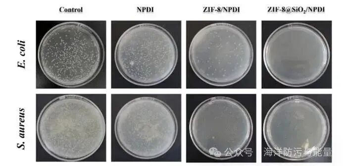 图8展示了通过菌落计数法对不同涂层样品(对照组、NPDI、ZIF-8/NPDI 和 ZIF-8@SiO₂/NPDI)进行抗菌性能表征的结果。该图直观地对比了各组的细菌生长情况,揭示了单纯的NPDI涂层抗菌能力有限,而一旦引入ZIF-8,涂层的抗菌效果得到显著提升。这一结果确凿地证明了ZIF-8组分在复合体系中发挥了关键的抑菌作用,为后续制备高性能抗菌复合涂层提供了实验依据。