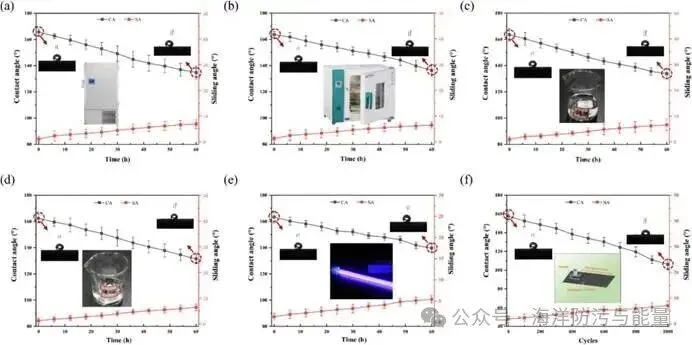 图6.(A)涂层在−80°C下暴露60h后接触角和滑动角的变化;(B)在80°C下暴露60h后涂层的接触角和滑动角的变化;(C)在强酸溶液中暴露60h后涂层的接触角和滑动角的变化;(D)在强碱溶液中暴露60h后涂层的接触角和滑动角的变化;(E)涂层在紫外光下暴露60h后接触角和滑动角的变化;(F)涂层被砂纸磨损1000次后接触角和滑动角的变化。