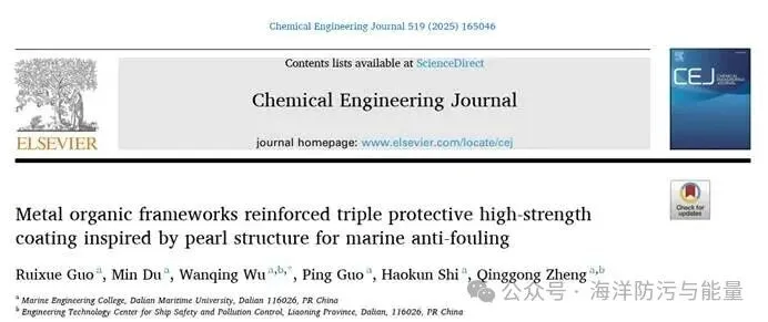 该文献以《Metal organic frameworks reinforced triple protective high-strength coating inspired by pearl structure for marine anti-fouling》为题,在“Chemical Engineering Journal”期刊上发布。