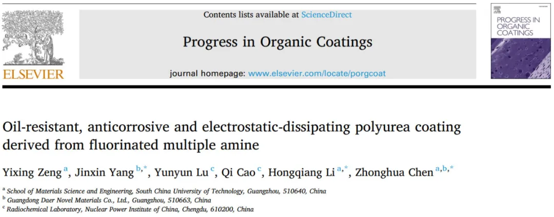 近期,华南理工大学陈中华/李红强团队成功制备了一种具有耐油性、防腐和静电耗散性能的聚脲涂层。