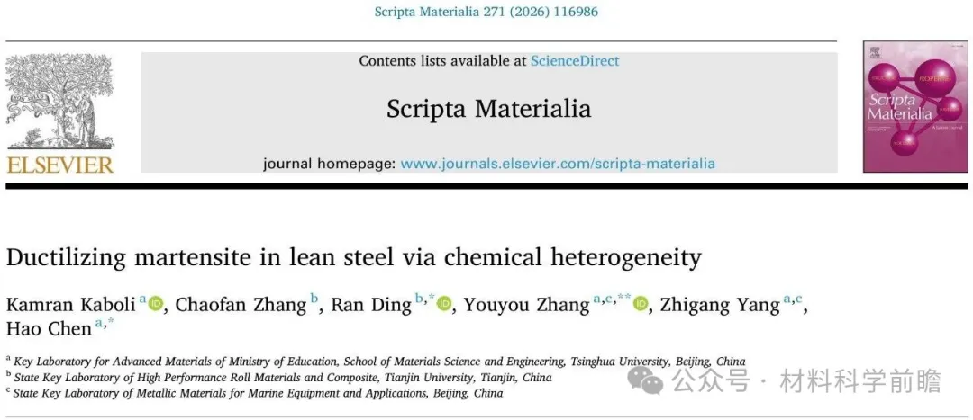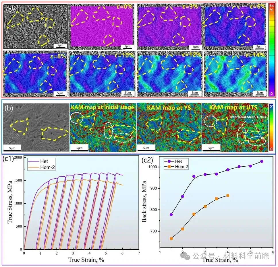 马氏体钢通常具有高的屈服强度和抗拉强度,但其塑性一般较差,难以满足工业界对高强高韧的要求。目前通常采用热处理等方法提升塑性,如淬火配分(Q&P)工艺可稳定残余奥氏体,奥氏体的相变诱导塑性(TRIP)效应可改善材料的性能。然而,这些方法通常需要复杂的工序和严格的温度控制,使得大规模工业化应用变得复杂。 近日,清华大学陈浩教授、天津大学丁然副教授和清华大学/鞍钢海洋装备用金属材料及其应用国家重点实验室张游游博士(通讯作者),在期刊Scripta Materialia上发表了题为“Ductilizing martensite in lean steel via chemical heterogeneity”的文章。研究人员采用闪速退火策略在低锰钢中构建了具有化学异质结构的马氏体,同时引入组织的异质性,显著提升了材料的强塑性协同。本研究阐明了Mn元素的变化对原奥氏体晶粒内马氏体变体选择的影响,从而在马氏体为主的基体中实现了强度不降而塑性提升的优异性能。和之前的研究不同,本工作在无奥氏体TRIP效应存在的情况下,主要依靠马氏体自身的组织和化学异质结构获得了高强高韧的性能组合。 本研究用低锰钢的化学成分为Fe-0.19C-1.5Si-2.0Mn-0.02Nb wt.%,热轧板经卷取、冷轧后进行3种不同的热处理。Het样品热处理为:300℃/s闪速加热到920℃保温2s,随后以300℃/s冷却至室温,实现完全奥氏体化且保留化学异质结构;Hom-1样品热处理为:920℃保温30s,加热和冷却速度和Het样品相同;Hom-2样品热处理为:920℃保温20min,水淬到室温,然后进行和Het样品相同的闪速退火热处理。所有样品在拉伸前进行170℃/20min的回火处理,模拟汽车行业的喷涂烘烤工艺。初始组织中,珠光体片层和渗碳体颗粒中存在Mn元素富集,铁素体中Mn元素浓度较低(~1.3 wt.%),如图1所示。 图1 原始组织:Region1珠光体区域和Region2弥散分布渗碳体颗粒的铁素体区域 3个样品表现出不同的微观组织,如图2(a-c)。其中,Het-1样品中存在两种不同类型的马氏体,MDM-贫Mn马氏体和MEM-富Mn马氏体。尽管3个样品的显微维氏硬度相当(~500HV),但是Het样品中的MDM和MEM区域存在明显的硬度差别,如图2(e)。硬度的差别主要是由于MEM区域富C富Mn,这对样品的力学性能也产生较大的影响。如图2(f)所示,Het样品展现出更高的强度,同时更高的塑性。 图2 SEM微观组织:(a)Het, (b)Hom-1, (c)Hom-2;(d)EPMA分析Het样品纳米压痕区域Mn浓度;(e)MEM和MDM区域纳米压痕结果;(f)3个样品的工程应力应变曲线 MDM区域表现出多个Bain group,每个group包含多个马氏体变体;而MEM区域只存在一个Bain group和单个马氏体变体,表明Mn元素不均匀性会影响马氏体的相变路径,如图3(a-d)。在快速冷却过程中,贫Mn区域先发生马氏体相变,应变会在周围的富Mn区域累积,导致富Mn区域形成马氏体单变体。相变过程中,MEM和MDM区域不同的马氏体相变行为会在两者界面处形成几何必须位错(GNDs),以缓解晶格畸变(图3(e))。 图3 (a)Het样品的SEM图像;(b-d)包含MEM和MDM马氏体的原奥晶界、Bain和变体构型;(e)MEM和MDM区域的HAADF TEM图像 MDM(3.5GPa)和MEM(4.8GPa)区域显著的硬度差别导致在变形过程中存在应变配分以及界面处GNDs的产生,如图4(a, b)。GNDs的累积在MDM和MEM界面处造成了强烈的背应力(如图4(c1, c2)),通过异质变形诱导硬化推迟了颈缩的产生,最终使得Het样品具有更高的强度和更优的延伸率。 图4 (a)DIC表征Het样品拉伸过程中的应变配分;(b) KAM图像表征Het样品拉伸过程中的GNDs演变;Het样品和Hom-1样品的(c1)加载-卸载-再加载曲线和(c2)背应力随应变的演变 综上,本研究通过对初始组织为铁素体+珠光体的冷轧钢进行闪速加热和冷却,获得了不同Mn含量的马氏体。Mn的不均匀性导致马氏体内部存在明显的变体选择和硬度差异,从而增强了GNDs介导的背应力。因此,Het样品在不依赖TRIP效应的情况下,强度和塑性同时得到提升,其综合性能优于均质马氏体样品。本研究表明,马氏体中固有的化学诱导结构异质性可实现卓越的强塑性协同效应,为先进高强度钢提供了一种简单高效的替代方案。