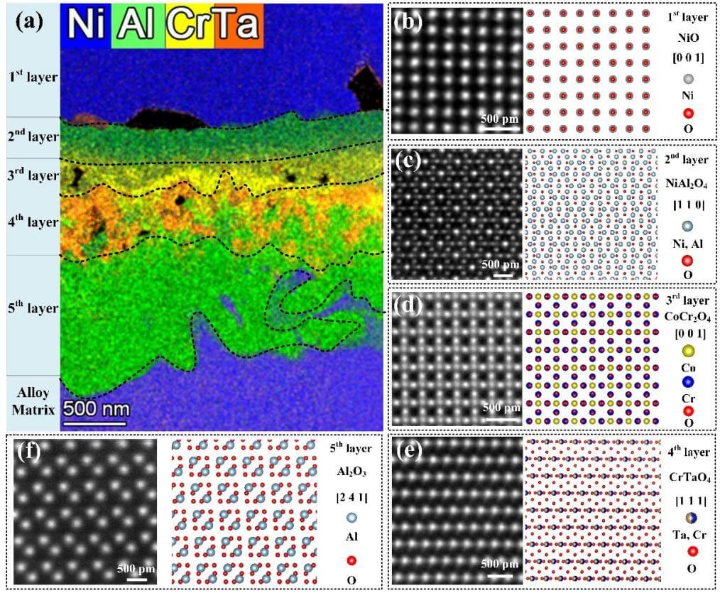 多尺度表征结果显示(图1),最终形成的氧化层结构是5个亚层氧化物结构,并非文献中普遍认为的3个亚层氧化物结构,空间分布上由表至深分别是:(Ni0.9Co0.1)O第1层、NiAl2O4第2层、CoCr2O4第3层、CrTaO4第4层和Al2O3第5层。