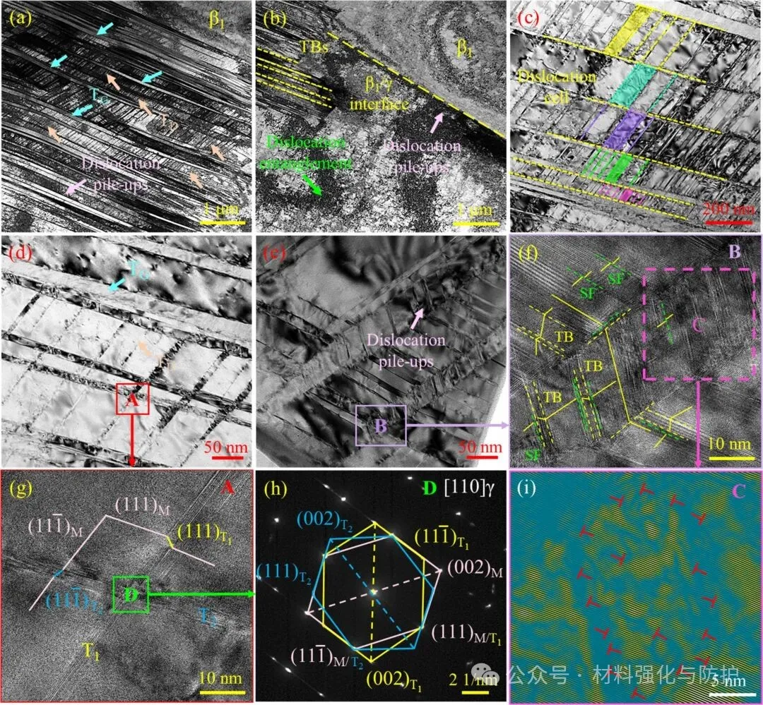 β1/γ界面处由于晶格失配与弹性常数差异,形成了高密度位错墙与层错(SFs),该界面区域存在局部应变集中,而Fe在β1相中的优先富集不仅稳定了层片结构,还在原子尺度上放大了界面应力场,在外加载荷作用下,γ相中大量层错迅速演化为超细纳米孪晶,并逐步交织形成三维孪晶网络,孪晶界与层错高度有序,其交叉区域成为新的位错储存单元,该自组织形成的纳米孪晶网络不仅有效阻碍位错滑移,还可持续吸收与再分配应变能。