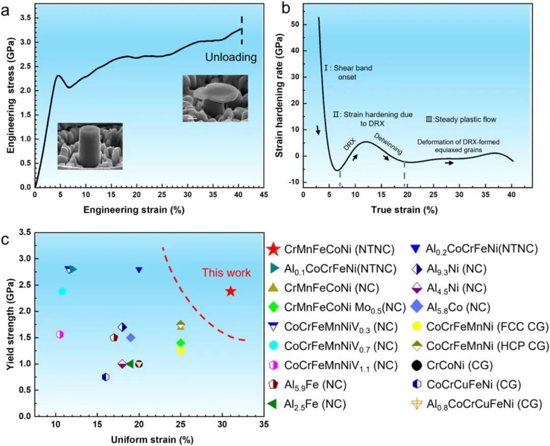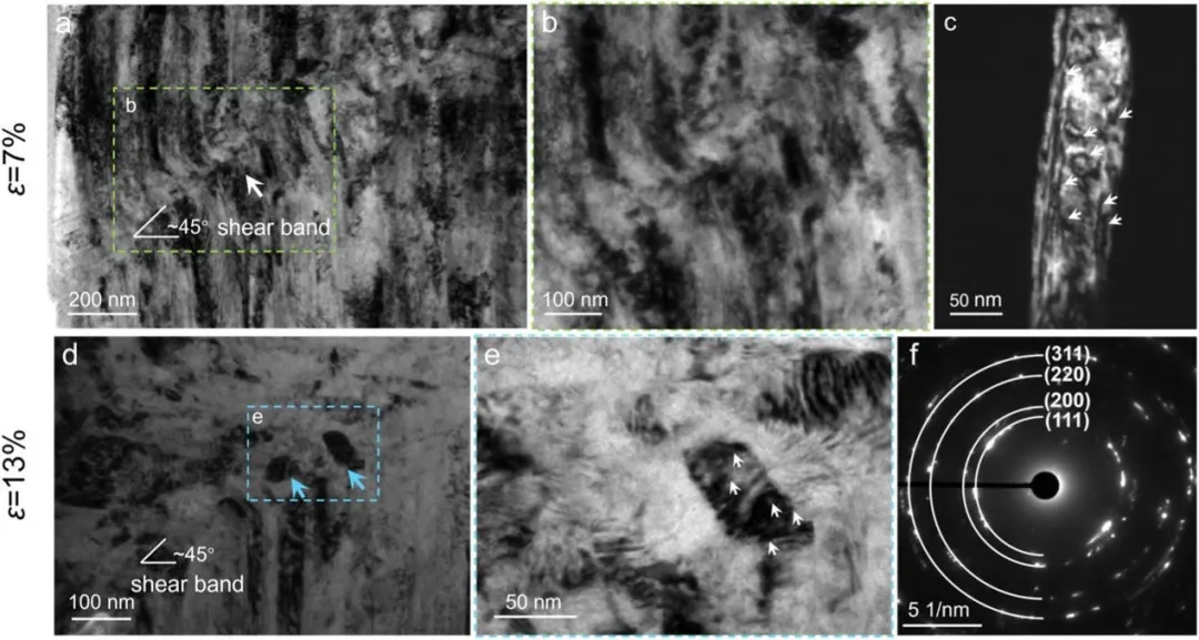 图1 NTNC HEA的微观结构表征。(a)XRD图谱证实了单相FCC结构。TKD IPF图谱从(b)样品的平面图和(c)样品的横截面图获得。(b)中的插图显示了相应的晶粒尺寸分布。(d)STEM-EDS元素图谱显示了合金的均匀化学成分。 图2 NTNC HEA的微观结构表征。(a)沿生长方向的沿着TEM图像,白色箭头指示样品生长方向。(b)样品的平面视图明场TEM图像。(c,d)平面视图取向的HRTEM图像。TB和SF用彩色虚线和白色箭头标记。(e)样品的截面明场TEM图像。(f)(e)中的选择区域的Magnetic HRTEM图像。 图3 NTNC HEA的机械性能。(a)来自沿着样品生长方向进行的微柱压缩试验的工程应力-应变曲线。插图SEM图像显示了微柱变形前后的结果。(b)应变硬化速率作为真实应变的函数,示出了由灰色虚线分隔的三个变形阶段:阶段I-由于剪切带形成而屈服后的急剧下降;第二阶段-硬化率上升后下降,归因于DRX诱导的晶粒细化和随后的去孪晶;阶段III-硬化速率接近于零,表明稳定的塑性流动由GB介导的等轴晶粒的变形和持续的去孪晶主导。(c)与其他合金的屈服强度和均匀应变的比较。NC和CG代表纳米晶和粗晶结构。 图4 NTNC HEA在不同压缩应变下的变形机制。(a-c)压缩至7%应变的微柱的TEM图像。(a)由白色箭头指示的剪切带的形成。(b)(a)中区域的磁共振图像。(c)显示柱状晶粒内位错的暗场TEM图像。压缩至13%应变的微柱的TEM图像:(d)剪切带附近新晶粒的形成,如蓝色箭头所示;(e)(d)中区域的磁共振图像,白色箭头突出显示新形成晶粒内的位错线;(f)剪切带附近的SAED图案。 图5 不同压缩应变下NTNC HEA的变形机制。压缩至20%应变的微柱的TEM图像:(a)在剪切带内观察到的显著动态DRX;(b)(a)的放大视图,显示具有约50nm的平均尺寸的DRX晶粒;(c)DRX晶粒内的高密度位错,如白色箭头所示;(d)选择用于HRTEM分析的DRX晶粒的双视场TEM图像,其中蓝色和绿色虚线框分别指示(e)和(f)中所示的区域:(f)Lomer-Cottrell位错锁的形成.压缩到30%应变的微柱的TEM图像:(g)在再结晶晶粒中发生GB畸变;(h)在DRX晶粒内观察到的位错线由白色箭头指示;(i)HRTEM图像和相应的FFT图案显示晶粒内不存在纳米孪晶。 图6 通过亚晶形成的位错介导的动态再结晶。(a)狗骨形拉伸试样的TEM图像,黑色双箭头指示拉伸方向。(b)变形诱导的TB处高密度位错阵列的累积,其中位错和TB由白色箭头和虚线标记。(c)HRTEM图像,显示了由与TB相邻的黄色虚线表示的亚晶界形成。(d)(c)的磁共振图像,清楚地显示出亚晶界处约13°的取向差。白色符号“Ʇ”表示位错。 图7 TB向常规GB的转变。(a)TEM图像,显示了在变形过程中晶粒内由白色虚线表示的弯曲TB。(b)界面区域的HRTEM图像,揭示了沿着同一边界的结构变化。(c,d)Magnetic HRTEM图像和(b)中右上区域的相应FFT图案。位错和TB分别用白色“Ʇ”符号和虚线标记。(e,f)来自(B)中左下区域的Magnetic HRTEM图像和FFT图案,显示了具有60°取向差的常规GB。(g)NTNC HEA的柱状晶粒在变形期间的DRX过程的示意图。 本文的研究成果如下: (1)通过磁控溅射技术制备出具有高密度预存纳米孪晶的纳米晶(NTNC)CrMnFeCoNi高熵合金,该合金呈现单相面心立方(FCC)结构,柱状晶粒平均尺寸约60nm,纳米孪晶与堆垛层错(SFs)在薄膜中均匀分布,平均孪晶宽度约3nm,且无元素在孪晶界面偏聚现象。 (2)微观柱体压缩实验显示,该合金屈服强度高达2.3GPa,压缩应变超过40%;拉伸实验中,标距段伸长量对应工程拉伸应变约31%,在屈服强度-均匀应变对比中,其性能显著优于众多传统纳米晶与粗晶材料,突破了纳米晶材料常见的强度-延展性权衡难题。 (3)明确室温变形时,剪切带内于约10%应变时激活动态再结晶(DRX),形成平均尺寸约50nm的等轴纳米晶粒。新生成的高角度晶界(HAGBs)可提高界面密度、阻碍位错运动,使流动应力提升至2.75GPa;同时,等轴晶粒的晶界能促进大应变下晶界介导的变形,配合去孪晶过程,有效抑制剪切局部化,实现稳定塑性流动,且应变硬化率呈现三阶段演变特征,分别与剪切带形成、DRX与去孪晶作用、晶界介导变形相关。 (4)通过拉伸实验揭示两种相互关联的纳米孪晶辅助动态再结晶(ntDRX)机制,一是位错在孪晶界(TBs)堆积,经位错重排形成亚晶界并演变为高角度晶界;二是共格孪晶界通过与位错相互作用直接转变为高角度晶界,且两种机制协同使DRX在较低应变(约13%)下即可启动,无需极高应变或高应变率条件。 (5)证实纳米孪晶在合金中兼具强化与促进DRX的双重功能,既通过阻碍位错运动、储存位错提升屈服强度与应变硬化能力,又作为位错堆积优先位点,为DRX提供有利形核条件,间接改善材料变形能力,为纳米晶高熵合金性能优化提供新的微观结构调控思路。