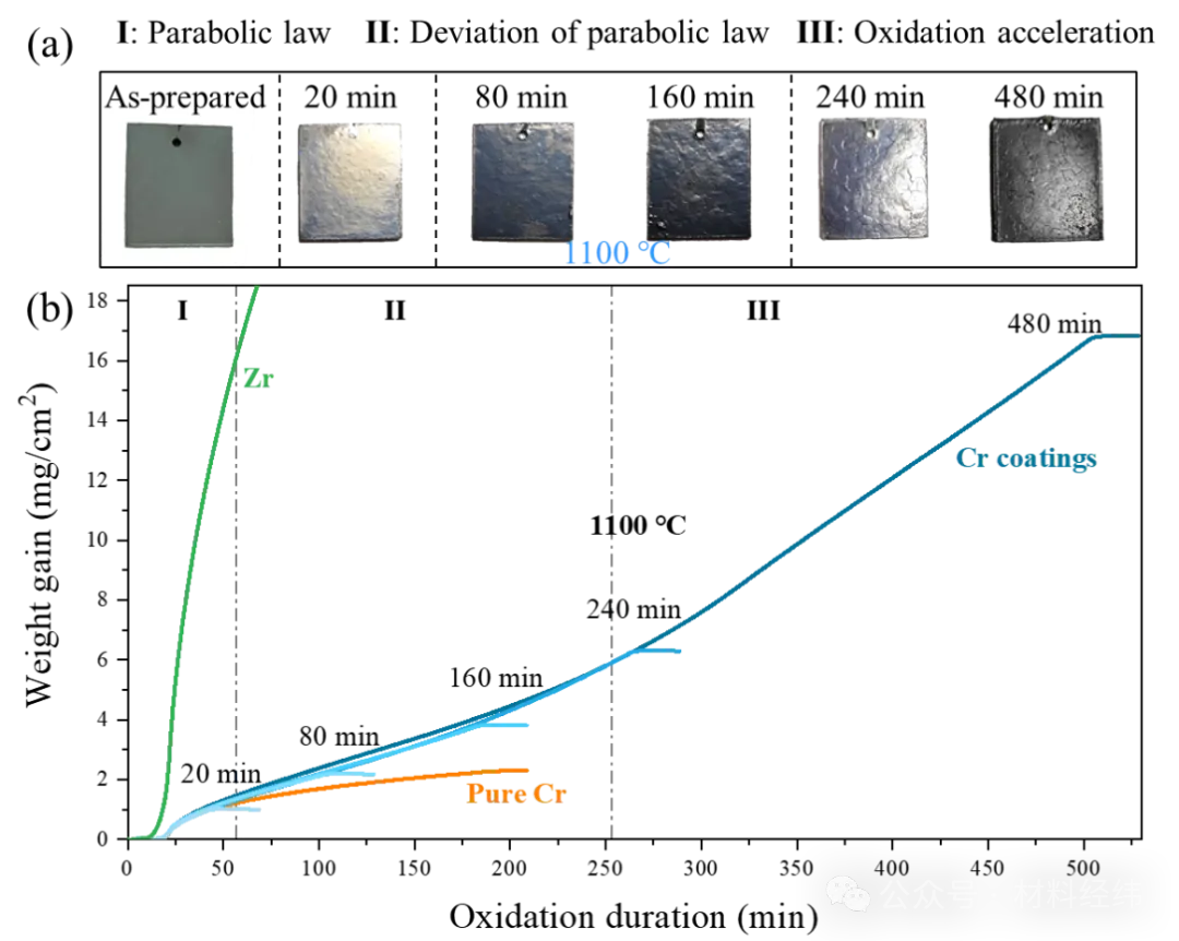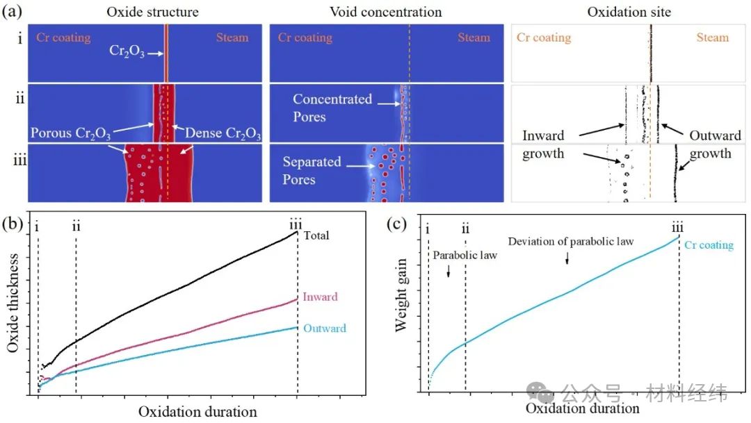 自从2011年福岛核电站爆炸发生灾难性事故后,事故容错核燃料(Accident Tolerant Fuel,ATF)的研发成为核电领域下一代先进核材料的重要方向。Cr涂层因其优异的耐腐蚀性、中子辐照耐受性、与锆基体良好的结合性等特点备受关注,而且Cr涂层不改变现有核燃料组件结构和制备工艺,成为目前最具经济性和可行性的事故容错核材料的包壳涂层材料。已有的研究多关注Cr涂层的氧化产物以及ZrO2形成后的涂层失效机制,而忽视了氧化中Cr涂层中的组织结构演变及其对氧化进程的作用,尤其关于Cr涂层在氧化过程中的孔洞形成与演化规律少有研究。 西安交通大学金属材料强度全国重点实验室孙军院士团队通过原位热重分析、多尺度微观表征与相场模拟相结合的系统研究方法,揭示了微孔主导Cr涂层高温氧化动力学转变的核心机制,为评估Cr涂层在冷却剂损失事故(Loss-Of-Coolant Accident,LOCA)条件下的结构完整性和防护性能提供了全新的视角。 本研究成果近期以Micropores governed high-temperature oxidation behavior of Cr coatings: kinetics analysis and phase-field modeling为题发表在国际材料科学与工程领域综合类著名学术期刊Acta Materialia上。 西安交通大学材料学院博士生邓鉴玺和左家栋副教授为论文共同第一作者,通讯作者为左家栋副教授、梁传鑫博士后和孙巧艳教授,孙军院士和宋忠孝教授为项目核心指导者。西安交通大学金属材料强度全国重点实验室为论文唯一通讯单位。 研究发现Cr涂层在高温水蒸气环境中随时间延长的氧化增重行为呈现清晰的三阶段动力学特征(图1): 第一阶段(0–20 min)为抛物线型氧化增重,Cr表面快速形成致密Cr2O3层,氧化速率由离子扩散控制; 第二阶段(20–160 min)出现偏离抛物线的形式,Cr2O3层中因阳离子空位聚集形成微孔,加速氧离子向内扩散,氧化模式从“外部生长”转向“内部生长”; 第三阶段(≥240 min)为加速线性氧化,Zr向外扩散与Cr2O3发生氧化还原反应,伴随柯肯达尔效应形成Cr/Zr界面孔洞(图2),涂层剥离导致氧化速率急剧上升。 图1 在1100 ℃水蒸气中氧化后试样的形貌与增重曲线:(a) Cr涂层Zr-1Nb合金宏观形貌,(b) Zr-1Nb、Cr涂层Zr-1Nb和纯Cr金属试样的氧化增重曲线 图2 在1100 ℃水蒸气中氧化160 min后Cr2O3及Cr涂层中孔洞结构特点: (a),(a1),(b),(b1) 纳米级和微米级孔洞结构,(c) Cr2O3-Zr氧化还原反应引发Cr涂层晶界处形成孔洞,(d) 柯肯达尔效应导致Cr涂层/Cr-Zr扩散层界面形成孔洞 这种独特的动力学转变机制,核心源于“空位聚集-微孔合并-结构失效”的连锁效应: Cr涂层的小尺度特征尺寸(微米尺度的涂层厚度和晶粒尺寸)导致背应力升高,抑制界面位错运动,降低空位湮灭效率,促使Cr2O3内部形成微孔(图3);微孔不仅阻碍Cr阳离子向外扩散,还为氧离子提供快速扩散通道,引发氧化模式转变;后续Zr原子扩散引发的氧化反应与界面孔洞粗化,进一步破坏了涂层完整性,最终导致加速氧化。研究团队通过相场模拟,直观地演示了微孔演化与氧化动力学的耦合过程,进一步验证了微孔对涂层氧化行为的核心调控机制(图4)。 图3 蒸气环境下Cr2O3孔洞形成机制。(a) 阳离子空位聚集,(b)-(c) 高背应力的Cr涂层导致Cr/Cr2O3界面处空位湮灭效率降低引发孔洞形成,(d) 孔洞阻止金属阳离子向上扩散,(e) 孔洞均匀化过程。 图4 Cr涂层从抛物线到直线氧化增重阶段Cr2O3孔洞结构演变的相场模拟:(a) 氧化膜结构,空位浓度和氧化位点的协同演化过程(模拟视频切片),(b) 外生长和内生长氧化膜厚度随时间变化,(c) 模拟的Cr涂层从抛物线转折到直线阶段的氧化增重曲线。 本研究首次明确微孔也是Cr涂层高温氧化动力学转变的关键因素。为核反应堆ATF材料的涂层设计、寿命评估提供了关键结果和依据。同时,研究融合实验表征与相场模拟的研究范式,为Cr涂层高温氧化机制解析提供了新参考。 研究工作得到国家自然科学基金(U21B2057、52301168、52394163)等项目资助,测试表征得到西安交通大学分析测试共享中心和材料学院实验技术中心的大力支持。 论文链接: https://doi.org/10.1016/j.actamat.2026.121931