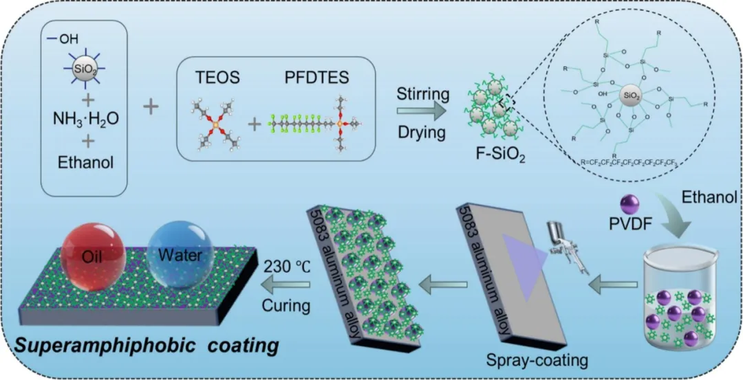 首先将二氧化硅纳米颗粒(SiO2 NPs)均匀分散在无水乙醇与氨水的混合溶液中,随后加入TEOS和PFDTES,制得氟化二氧化硅纳米颗粒(F-SiO2);然后将聚偏氟乙烯(PVDF)和F-SiO2加入无水乙醇中获得悬浮液,将悬浮液喷涂到抛光的5083铝合金基材上,制得PVDF/F-SiO2涂层。 所制备的涂层对水、乙二醇、花生油和十六烷的接触角均大于150°,滚动角均小于5°,对具有广泛表面张力的液体表现出优异的排斥性。该涂层具有优异的防污和自清洁性能。该涂层还具有优异的防腐功能,涂层表面的Rct增加了七个数量级,经过960小时的盐雾测试后,其表面未观察到腐蚀现象,仍能保持超疏水性,但超疏油性能略有下降。此外,在-10°C和-15°C的低温条件下,涂覆该涂层的铝合金基材上的水滴结冰时间比裸基材上的长8.6倍和2.8倍,表现出优异的防冰性能。 本研究制备的多功能涂层,集超疏水性、超疏油性、自清洁、防污、防腐和防冰性能于一体,为确保金属和合金材料的长期安全使用提供了一种有前景的防护材料,在众多工业领域具有巨大的应用潜力。 制备工艺示意图 PVDF/F-SiO2超双疏涂层制备工艺示意图。