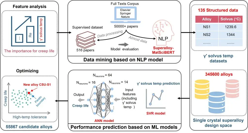 该研究首先开发了名为“Superalloy-MatSciBERT”的领域专用自然语言处理(NLP)模型,成功从超过五万份科研文献和专利中自动、精准地提取出135个高质量的γ′相溶解温度实验数据,构建了结构化的高保真数据库。在此基础上,团队训练了高精度的机器学习(ML)模型,能够准确预测新合金成分的γ′相溶解温度和蠕变寿命。依托这一强大的“AI大脑”,研究人员对345600种虚拟镍基合金成分进行了高通量筛选,并综合考虑成本、密度、组织稳定性及工艺窗口等多重工程约束,成功设计出一种新型低成本高性能合金——CSU-S1。