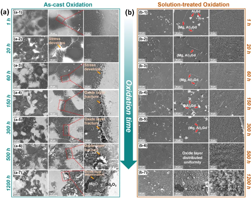图6所示。Mg-6Gd-1Al合金不同氧化时间后的显微组织比较,左图为铸态试样(a),右图为固溶处理试样(b)。铸态试样说明了氧化皮随时间(从1到1200小时)的演变,包括应力发展、裂纹萌生、裂纹扩展、氧化皮断裂和分层。溶液处理后的样品在不同的氧化时间表现出氧化皮的微观结构特征。经过长时间氧化(1200 h)后,溶液处理的样品呈现出均匀的氧化垢分布