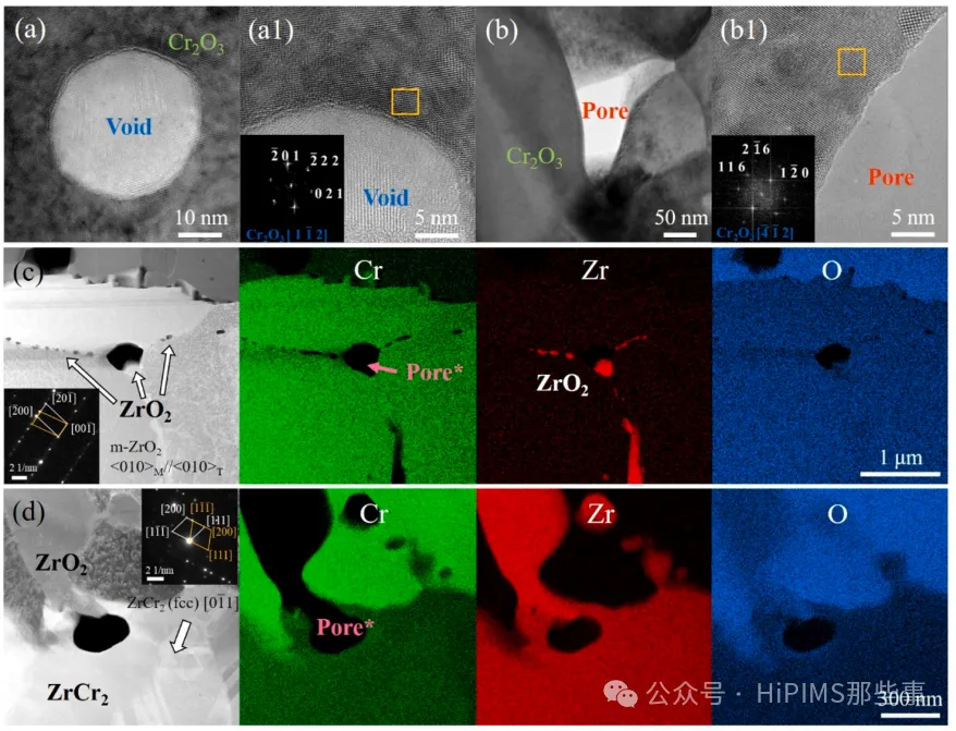 图6. 1100°C氧化160分钟后void和pore的微观结构。(a) void 和 (b) pore的明场TEM图像。(a1) 和 (b1) 是相应的放大的HRTEM图像,左下角分别为图6(a1)和(b1)的快速傅里叶变换图。(c) 孪晶ZrO₂颗粒的STEM图像和相应的EDS mapping结果,左下角是孪晶ZrO₂的选区电子衍射图。(d) Cr/Cr-Zr界面的STEM图像和EDS mapping结果,右上角是孪晶ZrCr₂的选区电子衍射图。