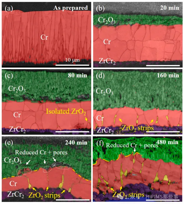 图4. Cr涂层样品在1100°C蒸汽氧化前和氧化后的EBSD相图。(a) 氧化前, (b) 20分钟, (c) 80分钟, (d) 160分钟, (e) 240分钟, (f) 480分钟。所有比例尺为10μm。