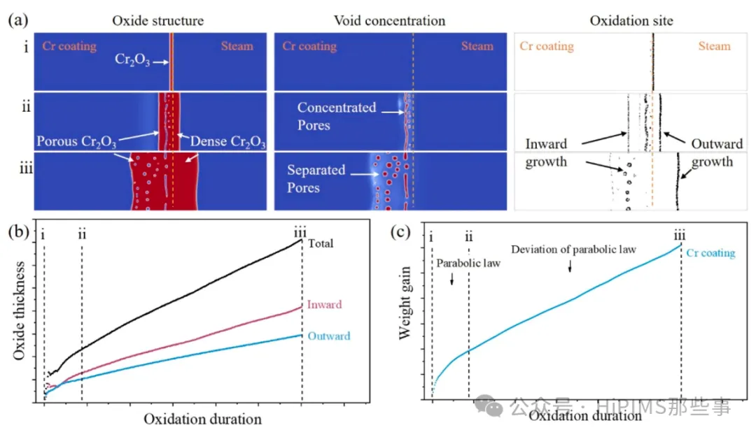 图9. 阶段I至II的Cr涂层蒸汽氧化相场模拟。(a) Cr₂O₃的氧化物结构、空隙浓度和氧化位点的协同演化过程(视频截图); (b) 相场模拟得到的氧化物厚度; (c) 模拟的Cr涂层增重曲线。