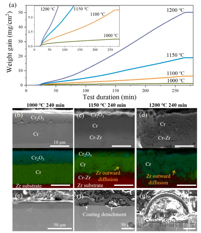 图7. Cr涂层样品在1000-1200°C蒸汽氧化过程中的增重曲线和截面形貌。(a) Cr涂层板在240分钟氧化期间的增重曲线。(b) 截面形貌演变和相应的EDS mapping。(e)-(f) Cr₂O₃/Cr界面的放大图像,用于研究残余Cr涂层的附着性能。