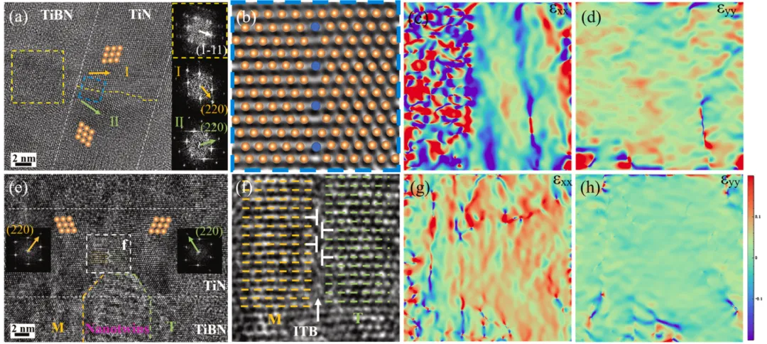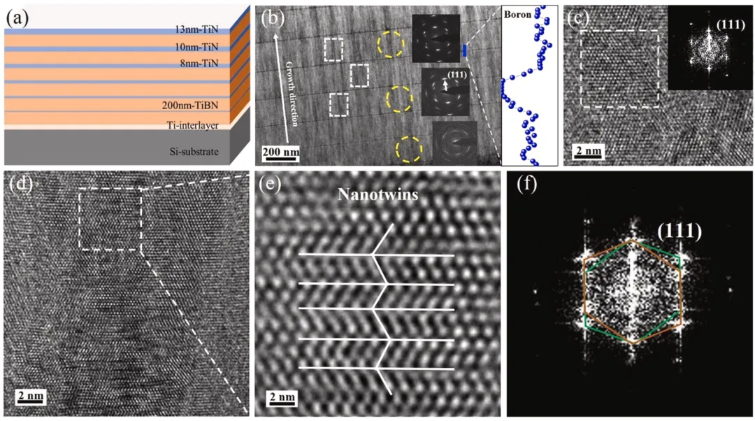 通过TiBN/TiN和TiBN/AlN多层结构设计,利用模板效应和巨大内应力,首次在超高堆垛层错能的TiN(10 nm)和AlN(1.5 nm)陶瓷层中实现纳米孪晶的跨界面生长,突破了传统陶瓷难以形成孪晶的限制。