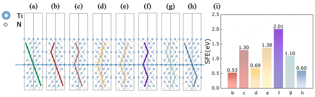 本研究通过多层结构的模板效应和内部应力协同作用,成功在具有极高堆垛层错能的TiN和AlN陶瓷层中诱导了纳米孪晶的跨界面生长。理论分析表明,纳米孜晶的形成由两种机制驱动:模板效应促进了TiN和AlN层中双侧结构的外延生长,而巨大的内部应力则在底层纳米孜晶区正上方的陶瓷层中产生横向应力,最终促成孜晶形成。由于TiN与AlN的晶格常数和晶体结构差异,TiN层中纳米孜晶稳定生长的最大厚度约为10 nm,而AlN层仅为1.5 nm。