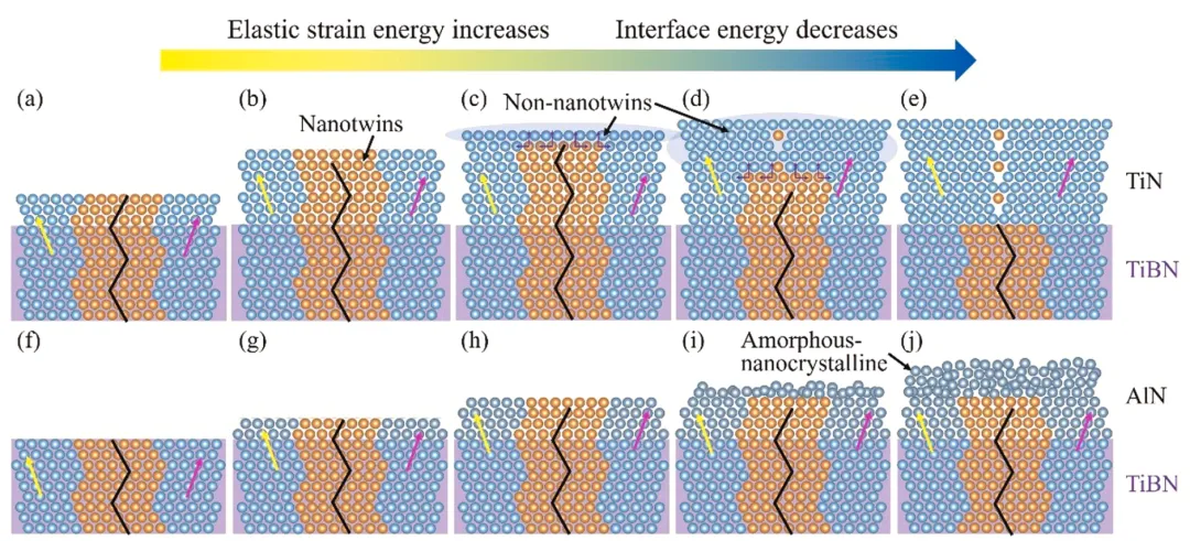 发现TiN与AlN因晶格常数和晶体结构差异,纳米孪晶稳定生长的临界厚度显著不同(TiN约10 nm,AlN仅1.5 nm),为超硬陶瓷薄膜的韧化设计提供了厚度调控依据。