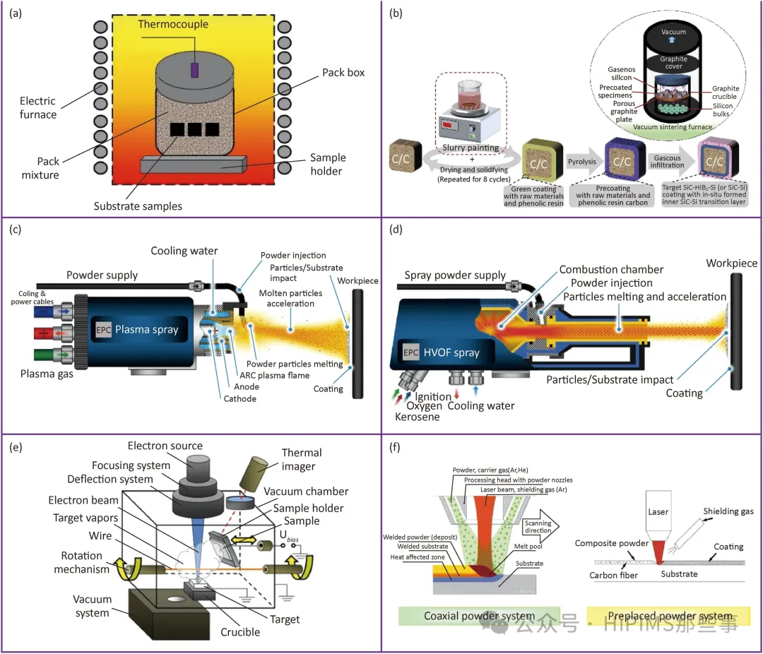 图2. 不同涂层制备工艺的示意图:(a) 包埋渗镀、(b) 料浆涂覆、(c) 等离子喷涂、(d) 超音速火焰热喷涂、(e) 物理气相沉积(PVD)、(f) 激光熔覆。