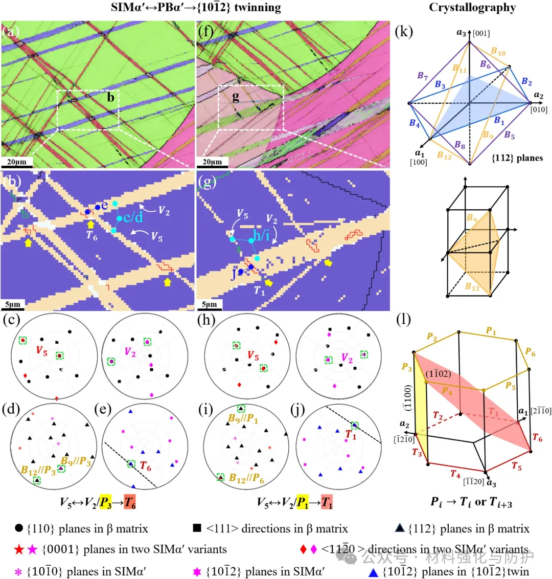 V5和V2变体间的相界与二次孪生变体T6共享<1120>轴,统计显示97.4%的案例中孪生平面沿<1120>方向与相界相交,这一规律可概括为Vm↔Vn/Pi→Ti或Ti+3,其中m,n=1…12和i=1…6。