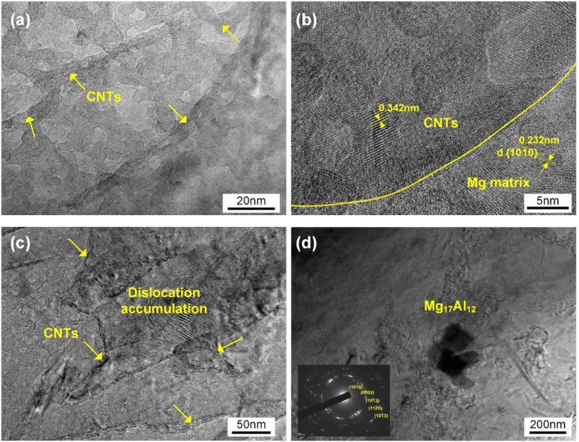 (a)CNT;(b)CNT与Mg基体之间的界面;(c)位错积累;(d)Mg17Al12。