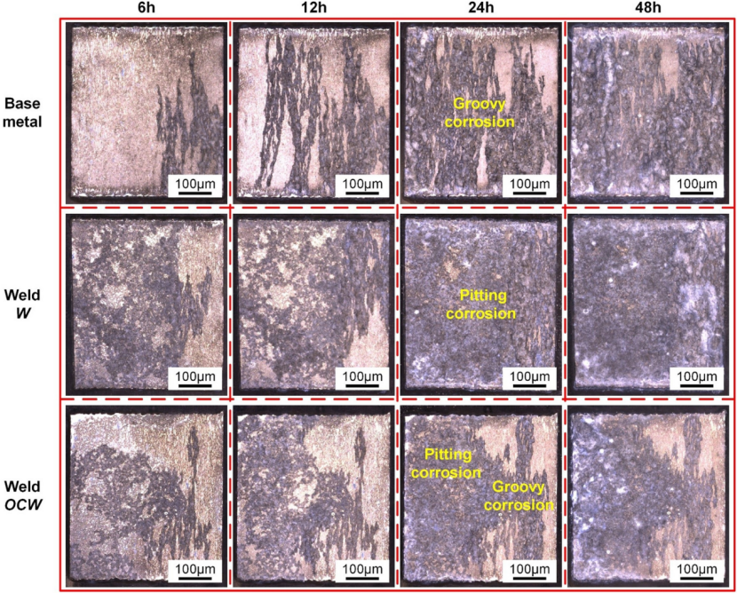 因此,如何提升焊缝耐蚀性已成为当前的研究热点之一,常用的改进方法包括成分设计、表面处理、工艺优化及焊后热处理。Nowak等人对比了QE22、ZRE1及WE43三种镁合金的耐蚀性,发现添加稀土元素的镁合金,其耐蚀性均低于AZ91镁合金。Zhao等人采用两步辐照工艺,成功去除了不锈钢焊缝表面的氧化膜,显著提升了焊缝的耐蚀性。Chen等人提出,焊接过程中施加外加磁场可减弱δ-铁素体的织构强度,并促进均匀的骨架状组织形成,从而改善奥氏体不锈钢焊缝的耐蚀性。此外,Zhang等人的研究表明,焊后热处理有助于奥氏体的形成、Cr2N相的溶解及枝晶偏析的消除,这些变化共同增强了激光焊接双相不锈钢的耐蚀性。尽管上述方法在提升焊缝耐蚀性方面均表现出一定效果,但它们普遍面临加工成本高、操作流程复杂、工业化应用潜力有限等现实挑战。