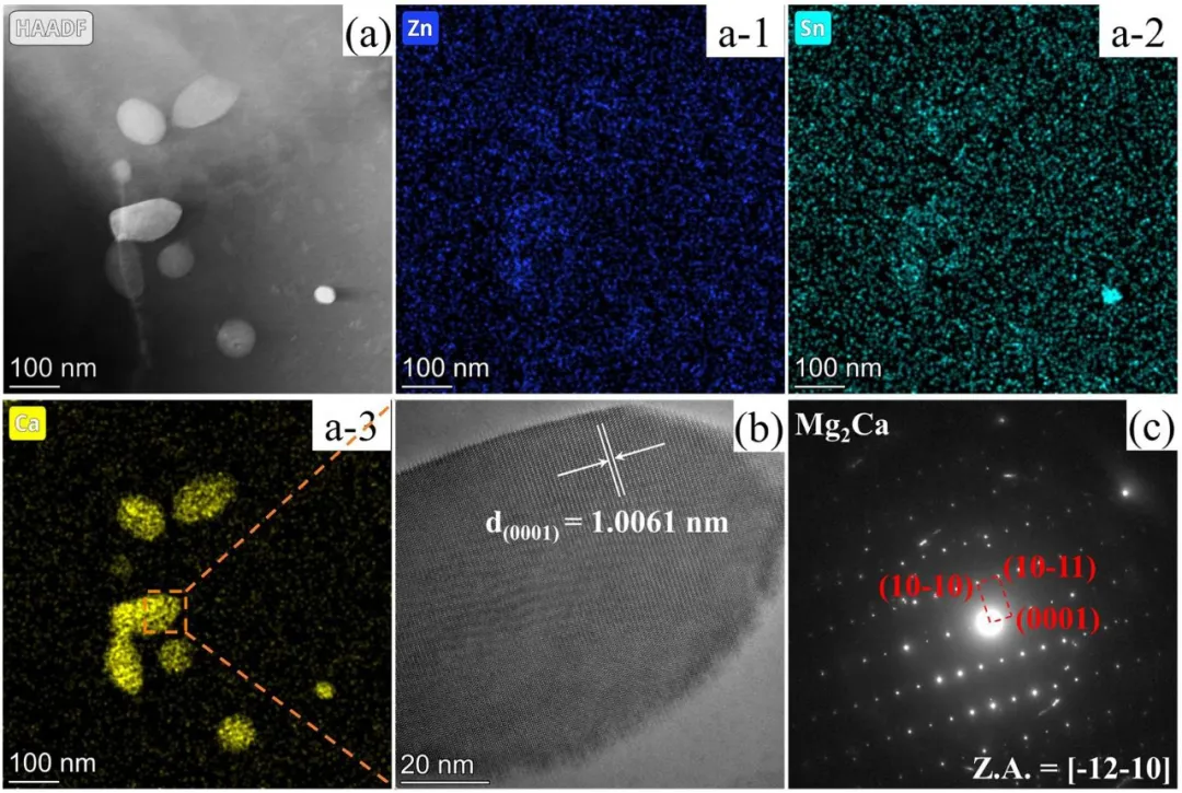 详细解读 01 图1通过电子背散射衍射(EBSD)的逆极图(IPF)和动态再结晶(DRX)晶粒尺寸分布图,展示了ZXT系列合金沿挤压方向的微观结构。所有合金均呈现由细小DRX晶粒包围变形晶粒组成的异质纤维状结构。统计结果表明,随着Sn/Ca原子比从1:4(ZXT4)降低至1:16(ZXT16),DRX晶粒的平均等效直径从3.01 μm减小到2.15 μm,而ZXT8的晶粒最粗(3.75 μm)。DRX面积分数则先增后减,ZXT8最高(55.6%)。这些差异与后续析出相的钉扎效应密切相关。 02 图5通过透射电子显微镜(TEM)分析了不同Sn/Ca原子比合金的微观结构演变。低倍明场像显示合金主要由DRX晶粒和残留的位错网络组成。未再结晶区域呈现高位错密度的层状亚结构,表明连续动态再结晶(CDRX)机制活跃。在高角度环形暗场扫描透射电子显微镜(HAADF-STEM)下观察到纳米析出相,其密度在ZXT8合金中最低,这解释了ZXT8合金再结晶驱动力较弱和DRX晶粒较粗大的原因。位错在DRX晶粒与变形晶粒界面处塞积,导致了异质变形诱导(HDI)强化。 03 图7通过高分辨率HAADF-STEM成像、EDS面扫描及选区电子衍射(SAED)对ZXT4合金中的纳米析出相进行了精细表征。EDS分析结合SAED花样鉴定出富Sn的析出相为CaMgSn金属间化合物,其与α-Mg基体存在[2-2 0 1]α-Mg // [0 -1 0]CaMgSn的晶体学取向关系。富Zn的析出相被确定为Ca2Mg6Zn3,这是Mg-Zn-Ca系合金中的典型相。这些纳米析出相对位错运动有钉扎作用,贡献了Orowan强化。 04 图8通过HAADF-STEM、高分辨TEM(HRTEM)和SAED对ZXT16合金中的富Ca相进行了表征。EDS面扫描显示该相富含Mg和Ca元素。HRTEM图像和相应的SAED花样共同证实该析出相为Mg2Ca。这些Mg2Ca析出相尺寸在45-150纳米之间,并倾向于沿晶界分布,有效阻碍了晶界迁移,从而促进了再结晶晶粒的细化。 05 图12展示了ZXT系列合金在Hank's溶液(37±0.5°C)中浸泡不同时间后的腐蚀产物膜截面形貌。经过7天浸泡后,所有合金均呈现均匀腐蚀特征。截面分析表明腐蚀产物膜具有双层结构:内层为复合氢氧化物/氧化物,外层为含吸附成核位点的磷酸钙沉积层。定量测量显示,在整个浸泡过程中,性能最优的ZXT4合金的腐蚀产物膜层最薄(约9.12 μm),而ZXT8和ZXT16的膜层较厚(分别约12.62 μm和11.29 μm),这与ZXT4合金最佳的耐腐蚀性相一致。