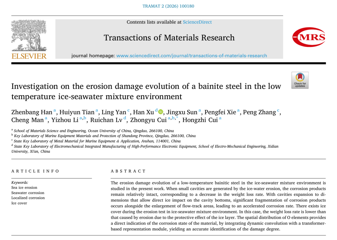 近日,中国海洋大学的科研团队在Transactions of Materials Research上发文,探讨了在冰‑海水混合环境中,低温贝氏体钢的腐蚀损伤演化规律。