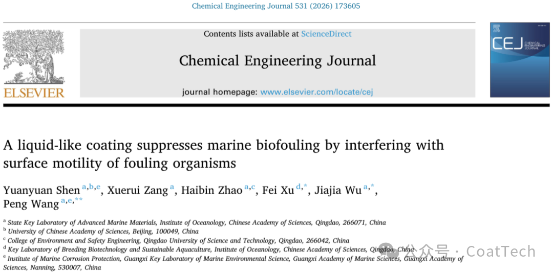 Chemical Enginnering Journal 近日,中国科学院海洋研究所的研究团队在国际知名期刊《Chemical Engineering Journal》发表最新成果,研发出一款基于辣椒素改性的CAP–PMHS 类液体防污涂层,通过干扰污损生物的表面运动和感知系统,实现了对微、宏污损生物的跨物种非致死防污,兼具优异的理化性能和环境友好性,为海洋防污技术开辟了新方向。 这款新型涂层的制备工艺简洁高效:研究团队以聚甲基氢硅氧烷(PMHS)为基底,通过一步硅氢化反应,将天然辣椒素(CAP)接枝到 PMHS 表面,成功制备出 CAP–PMHS 类液体涂层,全程无需复杂条件,易规模化生产。 经一系列表征测试,该涂层的理化性能表现亮眼:✅ 强疏水性:海水接触角达 103.32°±2.45°,细菌悬液接触角 97.36°±0.79°,水滴可轻松滑落,大幅减少生物初始粘附;✅ 超耐用性:100 次胶带剥离后接触角变化不足 2°,海水长期浸泡、砂纸磨损后性能依旧稳定,基底结合牢固;✅ 高透明性:300-800 nm 波段光学透明性与玻璃基底相当,可应用于海洋光学传感器、观测窗口等特殊场景;✅ 无释放环保:辣椒素通过共价键接枝牢固,无溶出性抗菌成分,避免对海洋环境造成二次污染。 图1:CAP–PMHS 涂层的快速制备 不同于传统 “毒杀式” 防污,这款涂层主打行为调控式防污,针对微、宏污损生物的不同特性,实现了精准且高效的抑制,实测效果令人惊艳。 研究以铜绿假单胞菌(海洋常见腐蚀性微生物)为微污损生物模型,发现 CAP–PMHS 涂层在10 分钟内即可使细菌初始粘附减少 96.3±0.4%,5 天动态培养后,生物膜生物量较纯 PMHS 涂层降低 98.6%,对硅藻等其他微生物也有广谱抑制效果。 其核心机制在于涂层能破坏细菌的化学感应系统和代谢通路:一方面显著抑制细菌的游动、群集、蹭行等运动能力,让细菌难以在表面定殖;另一方面干扰细菌的群体感应信号,减少毒力因子分泌,同时诱导胞内活性氧积累,使细菌无法形成成熟的生物膜,且脱离涂层后细菌可恢复正常增殖,真正实现 “非致死抑制”。 图2:辣椒素接枝涂层对细菌初始粘附及生物膜形成的影响 图3:辣椒素接枝对细菌运动能力及生长的影响 图4:细菌在聚甲基氢硅氧烷(PMHS)及 CAP–PMHS 表面的基因表达情况 以太平洋牡蛎幼体(典型海洋宏污损生物)为研究对象,涂层展现出极强的附着抑制效果:24 小时培养后,牡蛎幼体在涂层表面的附着密度仅为玻璃表面的 15%,附着抑制率达 85%,且幼体死亡率与空白组无显著差异,证明涂层仅抑制附着行为,不影响生物生存。 研究团队通过分子生物学手段进一步探明,涂层的作用靶点是牡蛎幼体足部高表达的 TRPM8 钙离子通道—— 这是幼体感知基底、触发附着的关键通道。辣椒素改性的涂层会干扰该通道的表达,阻断 Ca²⁺介导的附着信号传导,让牡蛎幼体在接触涂层后产生 “避害反应”,主动向涂层外的区域迁移,从行为上拒绝附着。 图5:辣椒素对牡蛎面盘幼虫运动及附着行为的影响 图6:TRPM8 通道参与调控太平洋牡蛎幼虫的附着过程 为验证涂层的实际应用效果,研究团队在西海岸公园码头开展了15 天海洋现场挂板测试。结果显示,CAP–PMHS 涂层表面始终保持完整,无明显水螅、藻类、贝类幼体等污损生物粘附;而对照组的 Q235 裸钢表面则污损严重,充分证明了这款涂层在实际海洋环境中的优异防污性能。 图7:钢试片在海洋环境中暴露 15 天后的宏观照片:(a1-a2)裸钢和(b1-b2)CAP–PMHS 涂层样品。 一段话总结:本研究通过一步硅氢化反应将天然辣椒素(CAP)接枝到聚甲基氢硅氧烷(PMHS)表面,制备出CAP–PMHS 类液体防污涂层,该涂层具备优异的疏水性、机械耐久性和光学透明性,10 分钟内可使铜绿假单胞菌粘附减少96.3 ± 0.4%,对太平洋牡蛎幼体附着的抑制率达约85%;其防污机制为从分子层面干扰污损生物的感知和运动系统,对铜绿假单胞菌破坏其化学感应与代谢通路、抑制运动能力,对牡蛎幼体则靶向其足部高表达的TRPM8 通道阻断幼体附着信号,且该涂层为无释放型、环境友好型,经海洋现场测试验证了优异防污效果,为跨物种非致死性防污材料研发奠定了理论和实验基础。 文章总体思维导图 文章链接:https://doi.org/10.1016/j.cej.2026.173605一种类液体涂层通过干扰污损生物的表面运动能力抑制海洋生物污损