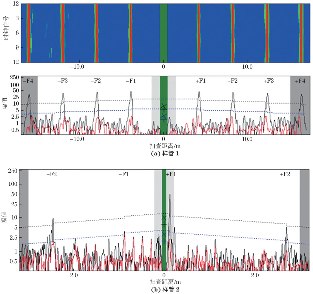 超声导波检测仪器没有相关标准及标定方法,此次标定选用已标定的样管进行试验。样管材料为碳钢,基本信息如下: 作为标准试块测试仪器的状态 长度4 m,直径219 mm,厚度6 mm 缺陷类型:环向沟槽8个 最小环向沟槽:5 mm×2 mm 作为标准试块测试仪器的性能、检测灵敏度 长度26 m,直径219 mm,厚度6 mm 缺陷类型:环向沟槽8个,平底孔8个 最小环向沟槽:5 mm×1 mm 最小平底孔:φ20 mm×1 mm 选用型号为Wavemaker G4的压电陶瓷低频超声导波检测仪,选用直径为8 in的探头,分别在样管1和样管2上进行仪器状态测试,结果如图1所示,可见仪器状态良好。 图1 仪器性能测试结果(F1,F2等表示特征信号) Wavemaker G4型压电陶瓷低频超声导波检测仪可以检出横向环向刻槽(样管1)、横向环向刻槽(样管2)、平底孔1(样管2)、平底孔2(样管2,焊接封堵)、平底孔3(样管2,焊接封堵),轴向距离误差分别为2.9%,3.5%,2.5%,1.7%,3.1%。可知在φ219 mm×6 mm的碳钢管道上可检出的最小缺陷尺寸为φ20 mm×1 mm的平底孔和5 mm×1 mm的环向沟槽,环向沟槽的距离误差最大为3.5%,平底孔的距离误差最大为3.1%。
