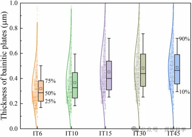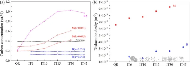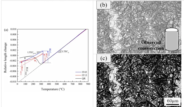 图2 (a) 展示拉伸曲线分析示意图;(b) 拉伸试样的光学显微镜图像(OM);(c) 通过Image-pro-plus处理的高对比度光学显微镜图像(黑色区域:B;白色区域:M + RA)图3 对(a) QR和IT6试样以及(b) IT10,IT45和IT60试样的时间-膨胀曲线,以及(c) 温度-相对长度变化曲线的分析图4 (a) QR,(b) IT6,(c) IT10,(d) IT15,(e) IT30,(f) IT45的透射电子显微镜(TEM)明场图像,以及相关的(f1) 暗场图像和(f2) 选区电子衍射图图5 (a) 基于线性热膨胀系数(LTEC)的贝氏体含量分析,(b) 基于RLCs的贝氏体含量分析,(c) 基于K-M方程和RLCs的马氏体含量分析图6 (a) IT6 (×100);(b) IT6 (×500);(c) IT10;(d) IT15;(e) IT30;(f) IT45的OM图像图8 (a) 典型实验衍射图谱分析,以及利用(b) 体心立方(BCC)+面心立方(FCC)和(c) 体心四方(BCT)+面心立方(FCC)晶体结构对IT45试样进行的里特瓦尔德精修结果表2 不同晶体结构模型下IT45钢贝氏体铁素体衍射峰拟合参数图9 (a) QR的XRD实验曲线及里特瓦尔德精修结果;(b) IT6 (×500);(c) IT10;(d) IT15;(e) IT30;(f) IT45表3 通过里特瓦尔德精修获得的每个试样的详细体积分数和结构参数C-s*:晶粒尺寸(nm);M-strain*:微应变;各组分数,晶格参数,晶粒尺寸和微应变的误差分别为±0.02,±0.001,±2和±0.0002图10 对里特瓦尔德精修结果的分析:(a) 不同相的碳含量以及(b) 位错密度图11 (a,d) IT6的扫描电镜(SEM)图,(b,e) IT15的SEM图,(c,f) IT45的SEM图;其中(a-c)和(d-f) 分别对应SEM图和背散射电子成像(BSE)图图13 谱带斜率(BS)图,用IPF-Z色彩标记的贝氏体铁素体的相关分区,以及(a-c) IT6,(d-f) IT15 和(h-j) IT30这三种热应变阈值的设定图14 (a) 贝氏体和(b) 马氏体板条的等效椭圆的最短直径图15 不同试样中贝氏体和马氏体的几何必需位错(GND)密度图16 不同观察位置(a) Ⅰ和(b) Ⅱ下的IT6试样的金相图像(500×)图17 IT10的BS和IPF-Z颜色图:(a,b) 观测区域Ⅰ;(c,d) 观测区域Ⅱ及(e) BS阈值的相关设定(1) 采用LTEC方法量化得出的贝氏体含量与其他方法相比存在较大偏差。LTEC方法的缺陷在于未明确阐述贝氏体铁素体线性热膨胀系数(LTECB)与合金成分之间的关系,且假设在整个等温处理过程中奥氏体线性热膨胀系数(LTECA)保持恒定。相比之下,基于相对长度变化(RLC)方法计算的贝氏体含量能得出更准确的结果。就马氏体含量而言,随着贝氏体的形成增加,K-M方程和基于RLC方法的结果之间的差异也会增大,这是由于Ms和Mf计算中引入了更大的误差。(2) 要获得统计结果,特别是对于贝氏体含量较低且微观结构差异较为显著的试样而言,需要大量的光学显微镜图像。(3) 假设贝氏体的晶格参数在整个等温处理过程中保持不变,而马氏体的晶格参数(即a 值)仅随碳的过饱和度而变化,那么通过XRD图谱就能成功获取统计材料信息,包括相分数、碳含量、晶粒尺寸以及微应变等。这些结果与OM和基于RLC的方法所得结果高度吻合。(4) 尽管EBSD技术常被用于区分贝氏体和马氏体,但由于BS阈值设定的主观性,其分析结果可能会存在偏差。此外,EBSD所观察到的局部区域给相的定量分析带来了困难,尤其是在不均匀的微观结构中。(5) 随着等温处理的进行,贝氏体的厚度会因自催化形核作用的增强而增加,而马氏体的厚度则会因未转变的奥氏体的化学和机械稳定化作用而减小。