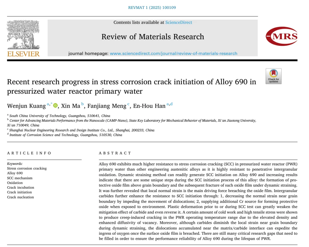 华南理工大学韩恩厚院士/匡文军团队:在压水堆一回路水冷却过程中,690合金应力腐蚀裂纹萌生的最新研究进展