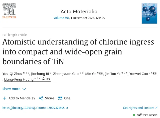 宁波材料所在TiN涂层晶界涉氯腐蚀微观机理方面取得进展