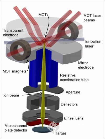 新仪器通过激光束和磁光阱捕获原子,将中性锂原子气体冷却至600微开尔文。然后采用激光将原子离子化,并进入电场加速,调整飞行方向,针对目标物将离子聚焦成离子束。