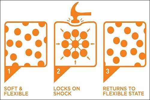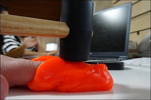 咋一看,就像一堆橡皮泥。平时它也的确有点像橡皮泥,只不过硬一点,松松垮垮没个正形。但是一旦遭到撞击,它就立刻变得很僵硬,从而吸收撞击能力,这种反应速度据说可以达到纳米级。然后,慢慢回复到原来状态。