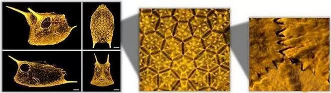 每个六边形的结构或鳞甲都有一个凸起,星形结构的应力分布在整个表面中心。该小组发现在这些鳞甲的内层形成一个复杂的结构,并且胶原纤维交错。