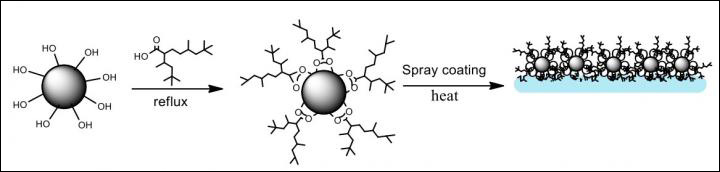 文章中,作者用将含有超支化烃链的改性羧酸包覆在简单合成的氧化铝纳米粒子表面。这些长链的存在致使材料表面显得有些粗糙,但同时也是材料疏水的第一道防线。粗糙表面是疏水材料的共有特色,它可以包埋空气,减小水滴和材料表面的接触,从而使水滴滑落。