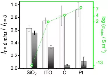 图6 黑色柱状图为在不同基底上滴镀的银纳米颗粒散射光在6分钟浸润于0.2 M碘化钾溶液后所剩光强。白色柱状图为对应的纯水中实验结果。绿色散点为相应基底的电导值。
