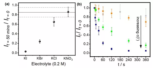 作者将银纳米颗粒滴镀到一个宏观尺度的玻碳电极表面后干燥,在反射暗视野光学显微镜下可观察到大量的明亮光斑(图2(a)),表示它们的存在。经分析,这些光斑对应的是纳米颗粒的聚合体,而非单个纳米颗粒,因此其散射光强度只能大致表示纳米颗粒的总数。当此表面浸润到0.2 M碘化钾溶液中6分钟后干燥,作者惊奇地发现纳米颗粒的散射光几乎完全消失了,而如果当此表面只浸润到纯水中6分钟后,纳米颗粒依旧大量存在。此外,图2(b)中对应的电极表面也被放置于扫描电子显微镜下观察,确认纳米颗粒本身确实消失了(而不仅仅是变小了或变成散光较弱的其他固体颗粒)。