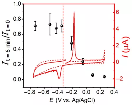 作者随后将图2(a)中对应的电极表面再度浸润到碘化钾溶液中6分钟,但在此期间施加不同的电极电压,发现在电压足够负时,纳米颗粒的消失几乎可以被完全抑制(图3,黑色散点图)。这个电压阈值(图3,垂直的红色虚线)正好与银纳米颗粒的氧化还原峰位(图3,红色曲线)重合。由此,作者认为,正是因为纳米颗粒的氧化被电极的负电压极化所抑制,我们才可以看到没有消失的银纳米颗粒。这显然表明纳米颗粒的消失是因为它被氧化溶解(或腐蚀)了。